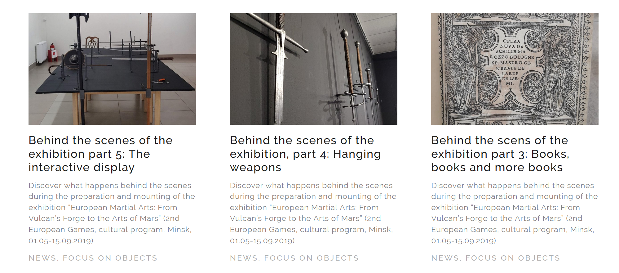 In certain circles, being pioneers matters. As an historian, I’m happy to say that we are only dwarves on shoulders of giants. And, it is not a question of humility. There have been exhibitions showcasing fight books and weapons before ours. Some of those also aimed at displaying martial arts. The curious reader may find my article reviewing exhibitions between 1968 and 2017. What is special, or extraordinary, about our exhibition is certainly its size and the care put into its displays of martial arts, which integrate objects, weapons, books and video material. Recently, two colleagues and friends also managed to set up exhibitions about HEMA in connection with conferences and demonstrations (see my reviews here and here). Our exhibition is then different not only because the size and the scope, but also because its context (the cultural program of the 2nd European Games) and the big invitational gala tournament in June.